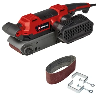 POWERFUL BELT SANDER: With its 850 Watts of power, the Einhell TE-BS 850 E belt sander is the optimal tool for sanding large areas of wood VARIABLE SPEED CONTROL: Due to the high belt speed of up to 400 m/minute and the revolution speed regulation, the grinding performance can be optimally adapted to the respective task PRECISE SANDING: 3 sanding belts (P80) are included. These can be exchanged without tools and precisely adjusted by means of sanding belt adjustment ELECTRIC SANDER WITH DUST EXTRACTION: Due to the integrated extraction with the dust collector box or the connection of a wet-dry vacuum cleaner, the workplace always remains clean CAN ALSO BE USED AS A STATIONARY SANDER: Due to the integrated storage space, the endurance lock and the supplied screw clamps, the belt sander is suitable for stationary use, Weight: 7.5177631342 Pounds, Manufacturer: Einhell