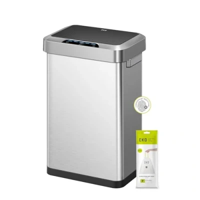 Premium Motion Sensor Technology: Experience the smoothest, most seamless lid opening and closing technology with this EKO hands-free automatic kitchen bin Ultimate Fingerprint Resistance: Say goodbye to smudges and hello to a clean flawless exterior that stays immaculate. The anti-fingerprint stainless steel finish keeps your space clean and stylish Sleek and Durable Finish: Meticulously crafted with a stainless steel finish, this stylish touchless rubbish bin offers a cool and smooth texture that’s durable and visually appealing for any home decor style 25% More Capacity: No liner design maximizes capacity by offering 25% more room to dispose of the trash Long-lasting Power: Powered by AA alkaline batteries, it can last up to 8 months of use, helping to reduce waste and save you money