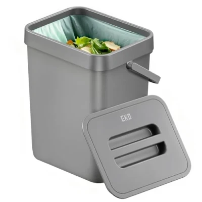 COMPOSTABLE FOOD WASTE CADDY: Go green with the EKO food waste caddy. Easily dispose of all your vegetable peelings and scraps as you cook, to compost later. This keeps your main kitchen bin free from smelly food waste, and helps reduce waste going to landfill EASY DISPOSAL: The bin features a removable lid for easy disposal of food waste while preparing food. The bin is compatible with our EKO compostable bin liners to keep your bin protected from the waste HANG OR MOUNT: The food caddy has a handy hook, allowing it to be hung over kitchen or bathroom cabinet doors. With a 3M sticky pad on the back, you are able to mount it on walls without leaving a trace. Or it can stay on your kitchen counter or window sill COMPACT & CLEAN: The dimensions are 20.5cm x 16cm x 13cm, small and discreet enough to keep on your countertop or tucked away in a cupboard EASY TO TRANSPORT: Designed with a sturdy handle, this compost bin is lightweight and portable, making it effortless to carry around your kitchen or compost area. Perfect for hassle-free waste disposal wherever you need it