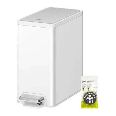 EKO Slim Small Bathroom Trash Can with Lid, Stainless Steel Garbage Removable Inner Bucket, 6L / 1.6 Gal, Step On Bin (White)
