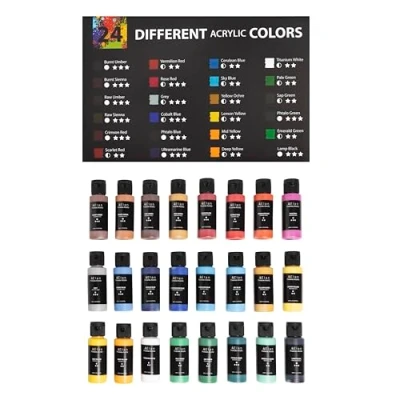 VIBRANT COLOURS - This professional acrylic paints set features high-quality pigments designed to deliver intense colour coverage with every brush stroke. Experience the joy of painting with the acrylic paint sets for adults. SAFE AND NON-TOXIC - All Elan art supplies for adults are made from non-toxic ingredients, ensuring a safe and carefree painting experience for artists of all ages. WIDE ARRAY OF APPLICATIONS - Our artist acrylic paint set is compatible with various surfaces. Acrylic paints set for adults can colour practically anything, from rock painting to canvas painting, wood panel painting, and much more! COLOUR CODED 60ML TUBES - This acrylic painting set is designed with convenience in mind. The colour coding provides quick and easy identification of the various acrylic paint tubes. 24 COLOURS - Unleash your creativity with a diverse selection of 24 rich colours in our acrylic paint sets for artists.