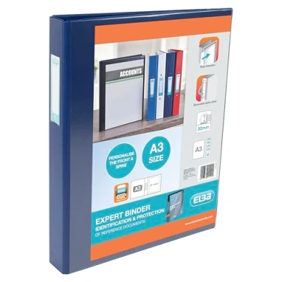 Elba A3 4 D Ring Binder, 30mm capacity, 35mm spine, Presentation Folder with Customisable Cover, Portrait, Blue (Single)