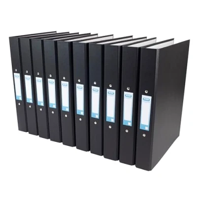 Brightly coloured ring binder made from strong paper covered board Use with punched pockets and dividers without overhang due to the wider A4+ size 30mm spine with 25mm capacity which can hold up to 250 sheets 2 O-rings hold the papers securely in place Spine label for easy identification of different projects Pack of 10 Black Folders