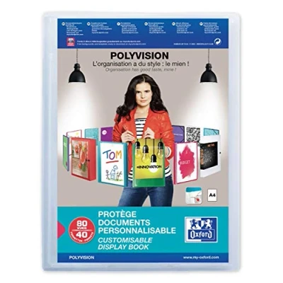A4 display books made from bright, flexible polypropylene material Transparent pocket on front for personalisation 40 clear pockets: Space for 80 sheets of paper 100206232