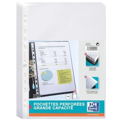 Extra large size: easy to insert documents and large capacity Compatible with A4XL file folders Smooth finish: perfect transparency Large capacity: 50 sheets per pocket Material: polypropylene