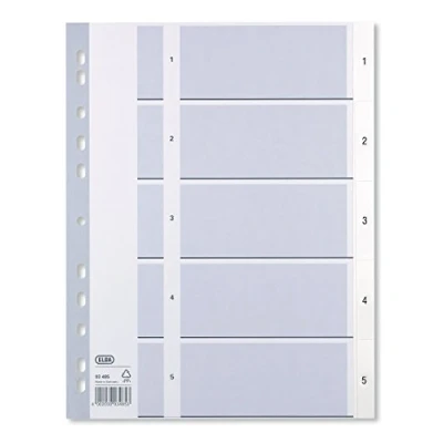 Amazon MarketplaceIndex 1 - 5, 5 pieces Made from robust 0.15 mm thick polypropylene film Writeable cover sheet Cover page, index sheets and tabs white Dimensions: 225 x 297 mm (W x H)
