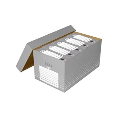 Size: DIN A4, Dimensions: 370 x 622 x 322 mm (W x D x H) Grey / white Made from robust, corrugated board With printed inscriptions for your storing/ archiving, and cut-out handles Box of 5