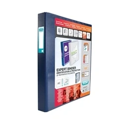 A3 portrait ring binder. 4 D-ring mechanism. Capacity: 30mm (300 sheets). Spine: 40mm. Clear front pocket for personalisation. Durable polypropylene covered board. Colour: Blue.