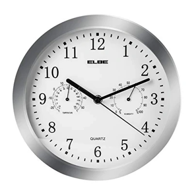 Elbe Wall Clock with Thermometer and Hygrometer, Temperature Humidity, Diameter 25 cm, White Panel Frame, Battery Operated, Metallic Silver, No aplicable