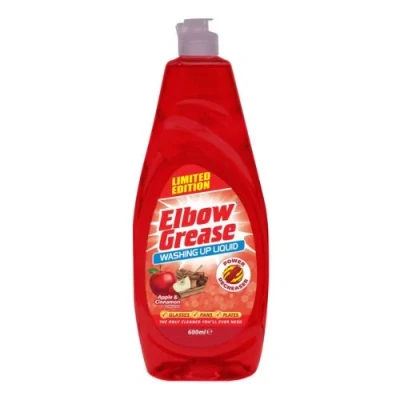 Introducing Elbow Grease's new Apple & Cinnamon Washing Up Liquid! With our ultimate power degreasing properties, you can easily remove stubborn food deposits and make short work of washing up. Enjoy a delightful Apple & Cinnamon scent and a fantastic lather! Get the most out of every wash with the generous 600ml size. Elbow Grease - the ultimate solution for your cleaning jobs!. 1 x Elbow Grease Apple & Cinnamon Washing Up Liquid 600ml. Power Degreaser. Cleans glasses, pans and plates