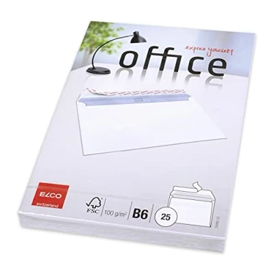 The ELCO Office B6 envelope is the ideal choice for efficient working in the office or at home. This bright white envelope impresses with its practical design without a window and a reliable adhesive closure that allows for easy and secure sealing. Made from sturdy 100 g/m² paper, it ensures stability and durability. With ELCO Office, you can optimize your professional correspondence and workflows in an elegant way. This envelope stands for first-class Swiss quality with its FSC certification. Each pack contains 25 B5 (125 x 176 mm) envelopes.