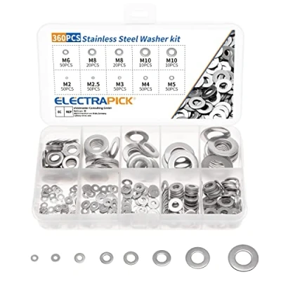【Size and quantity】Package contains 360 pcs flat washers,and 1 pcs transparent packaging box.Variety of size: M2 M2.5 M3 M4 M5 M6 M8 M10, 8 commonly used types of flat washers can meet your different needs. 【Material】Flat washer made of stainless steel material,Strong,which serves for a long using time.And smooth surface without burrs,which has better corrosion resistance quality. 【Packing box】Packing Box these small grids are separated individually which you can take out flat washers of different sizes easily. And the lid is marked with the corresponding size, which is more convenient for resolution. 【Widely used】Flat washers widely used Electric appliance for household and commercial .Any Outdoor and indoor can be Application. 【Function description】Flat washers is in order to increase the screw surface,pad to prevent screw loosening, intended for the general use under the head of a bolt.Used to reduce friction, isolation, and prevent loosening or dispersion。You can also be used to make necklaces, ornaments., Manufacturer: ELECTRAPICK