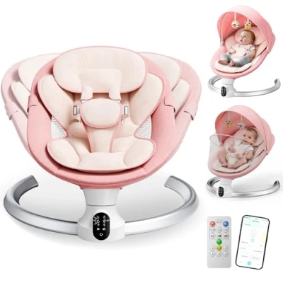 【Baby Swing for Infants to Toddlers】 Your baby's safety and comfort is our top priority! Constructed with an ultra-stable base and sturdy frame, our baby swing is equipped with a breathable seat cover, a removable skin-friendly mattress and an adjustable pillow, and also features an adjustable 5-point harness to ensure your baby stays in place. With ergonomic design, it provides great protection for your baby's neck and spine. 【Multi-function】 The baby rocking chair provides multiple functions to soothe your baby. It can rock smoothly at 5 angles (18°, 21°, 23°, 25° or 31°) with scientific amplitude and speed, simulating the natural rocking posture of parents. It has 10 built-in preset lullabies with adjustable volume. In addition, there are 3 timers for you to set the rocking time of 8, 15 or 30 minutes (warm reminder: pull out the latch to start the rocking function; insert the latch to lock the rocking function) 【Bluetooth Music Playback】 This electric swing for baby takes advantage of the advanced Bluetooth connectivity to achieve the control range of 0-5 meters, allowing parents to wirelessly connect their phone to play their baby's favorite soothing songs or nursery rhymes. It offers peaceful or joyful moments for your little one. 【Phone APP & Remote Control & Touch Panel】 The baby rocking chair is designed with convenience in mind. You can use the app to control it after installing the app on your phone and connecting the Bluetooth. You can also operate it with the included remote control or the advanced IMD touch panel on the base. 【Portability for Indoor or Outdoor】 It is a breeze to assemble and disassemble the newborn swing, and the seat cover, mattress and pillow are removable and machine washable. Our portable baby swing comes with an AC adapter with USB cable for indoor and outdoor use. It also includes a canopy with mosquito net to block strong sunlight and insects, protecting baby's delicate skin.
