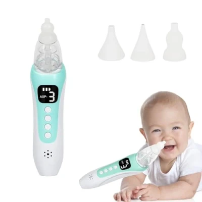 【Powerful Electric Suction】This electric nasal aspirator features 3 adjustable suction levels, with a maximum power of 63Kpa, making it highly effective in clearing stubborn mucus and relieving nasal congestion for your baby.Gentle yet effective, nasal aspirator employs a soft suction action to swiftly eliminate secretions and nasal congestion, ensuring your baby can breathe, sleep, and eat with ease. 【Safe and Healthy Material】The baby nasal aspirator is crafted with soft, food-grade silicone that is gentle on your baby’s delicate nasal passages. electric baby nasal aspirator is accord medically tested safety suction standards to avoid damage baby's delicate nasal mucosa, mouth contact, and cross-infection. Three independent silicone tips attached will also be the assurance of absolute cleaning. 【Soothing Features】This baby nasal aspirator has a built-in upgraded motor with high speed and low noise, which is not easy for baby to notice, and can easily suck out the boogers.This aspirator also provides cheerful songs to attract baby's attention,which can keep baby feel comfortable and effectively relieve baby's resistance to nasal aspiration. 【Easy to Clean】The electric nasal aspirator comes with two silicone tips that suitable for different baby periods.The baby nose cleaner has a detachable design, just open the slime cup and rinse with warm soapy water to protect your baby's health. The hygienic, quick-drying design ensures the aspirator stays clean, preventing bacteria buildup and keeping your baby safe. 【Portable & Rechargeable】This electric sucker is lightweight and compact which can be easily put in bag or baby's car, and it comes with built-in 600 mAh battery which ensures a long time use.It offers up to 120 minutes of continuous use.