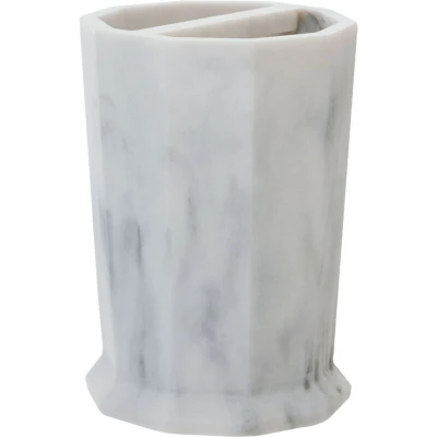 General description This toothbrush holder features a tapered design with polygonal sides, adding a geometric accent to your bathroom decor. It has dual open sections for elegantly storing toothbrushes, while the light grey outer with a marble effect and mild veining provides a soft visual appeal. This holder can be paired with the Riviera lotion dispenser or tumbler for a coordinated aesthetic. Technical specifications Dimensions: 8 x 12 x 8 cm