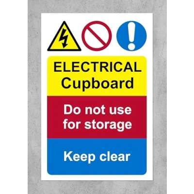 Electrical cupboard do not use for storage keep clear safety sign. Self adhesive sticker. Printed using the latest digital technology and laminated for extra durability. Remove backing film and apply to dry, smooth, oil free surface. All signs come with a 5-year warranty. All our signs are UV resistant meaning they will not fade in sunlight. Our vinyl stickers are temperature resistant from -40°C to +80°C.