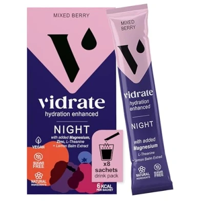 Electrolytes Powder Hydration Sachets Packed with Vitamins Zero Sugar Rehydration Sachet No Artificial Sweeteners by ViDrate Night Time Mixed Berry Small Pack 8