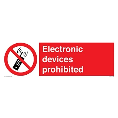 P013 : No activated mobile phones This sign is made from vinyl / sticker Air Release vinyl makes it easy to stick to flat, clean surfaces without bubbles. Not for rough, plastic or dusty surfaces. 62 landscape Sign Text: Electronic devices prohibited