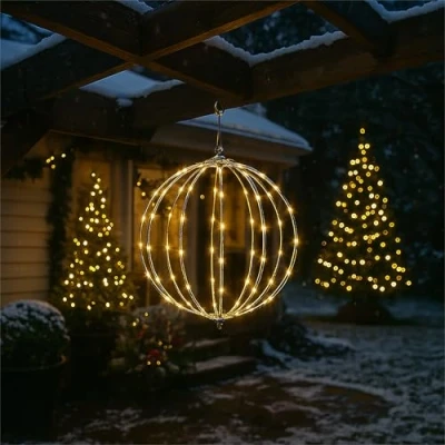Exquisite copper gold sphere with LED lights for festive Christmas decorations Versatile design suitable for both indoor and outdoor use Energy-efficient LED lights provide a soft, warm glow 6 Hour on 18 Hour off Timer Power Supply With 10m Lead Includes power supply for convenient electrical connection