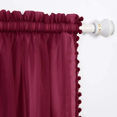 Elegant Comfort Semi Sheer Pom Tassels Curtains 2 Panels Set with 2inch Rod Pocket Solid Curtain Drapes for Living Room, Bedroom, W60 X L84, Burgundy