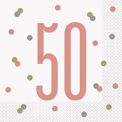 ROSE GOLD ELEGANCE: Add a touch of sophistication to your event with these elegant 50th glitz rose gold luncheon napkins, featuring a stylish and on-trend rose gold design, perfect for adding that extra sparkle to your celebration. HIGH-QUALITY MATERIAL: Crafted from premium-quality material, these 16cm luncheon napkins are both soft and strong, ensuring a luxurious feel for your guests and reliable performance throughout your special occasion. PERFECT FOR ANY CELEBRATION: Ideal for parties, weddings, and all types of special occasions, these rose gold luncheon napkins will elevate the ambiance of your event, impressing your guests and making a lasting impression. EASY-TO-USE CONVENIENCE: Pre-folded and ready to use, these elegant 50th glitz rose gold luncheon napkins make setting your party table a breeze and provide effortless clean up, allowing you to focus on creating unforgettable memories. GENEROUS 16 COUNT PACK: Each set of elegant 50th glitz rose gold luncheon napkins comes with 16 stylish napkins, providing ample coverage for your dining needs and ensuring that every guest can enjoy the luxury and elegance of these stunning napkins., Manufacturer: Unique Party