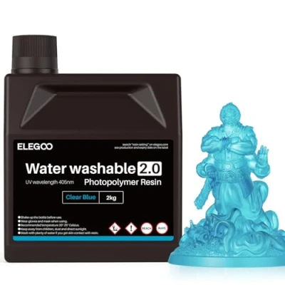 【Water Washable】ELEGOO Water Washable Resin 2.0 has upgraded its formulation, improving viscosity, shrinkage rate compared to other water wash resins. It cleans easily without the need for alcohol/IPA, providing a clean and efficient 3D printing process 【Low Shrinkage&Sharp Details】ELEGOO Water Washable Resin 2.0 boasts low shrinkage, ensuring high precision in printed models with smooth surfaces and rich, clear details, suitable for various components and model printing 【Low Viscosity&High Stability】With a viscosity of 109.40 mPa.s/25°C, water washable resin is 76% lower than 1.0 resin and 50%-60% lower than other resins on the market, offering higher stability and printing success rates 【Fast Curing】Water Washable Resin 2.0 excels in overall performance, enhancing printing speed, shortening curing time, and improving printing efficiency while maintaining model performance and detail 【Wide Applications】Compatible with most LCD 3D printers using 405nm UV light source technology, with a wide range of applications from tabletop models to industrial parts that require a certain strength or toughness