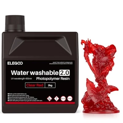 ELEGOO Upgraded Water Washable 3D Printer Resin 2.0, 405nm UV Curing with Lower Shrinkage and Higher Precision for LCD Printing Clear Red 2KG