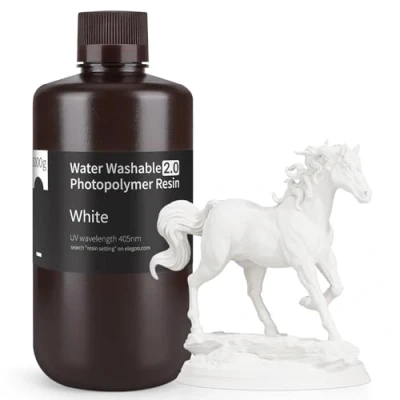 【Water Washable】ELEGOO Water Washable Resin 2.0 has upgraded its formulation, improving viscosity, shrinkage rate compared to other water wash resins. It cleans easily without the need for alcohol/IPA, providing a clean and efficient 3D printing process 【Low Shrinkage&Sharp Details】ELEGOO Water Washable Resin 2.0 boasts low shrinkage, ensuring high precision in printed models with smooth surfaces and rich, clear details, suitable for various components and model printing 【Low Viscosity&High Stability】With a viscosity of 109.40 mPa.s/25°C, water washable resin is 76% lower than 1.0 resin and 50%-60% lower than other resins on the market, offering higher stability and printing success rates 【Fast Curing】Water Washable Resin 2.0 excels in overall performance, enhancing printing speed, shortening curing time, and improving printing efficiency while maintaining model performance and detail 【Wide Applications】Compatible with most LCD 3D printers using 405nm UV light source technology, with a wide range of applications from tabletop models to industrial parts that require a certain strength or toughness