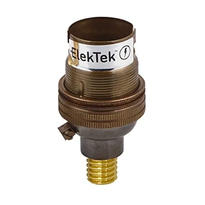 Standard UNSWITCHED B22 (22mm) BC Bayonet Cap Lamp Holder with shade ring - suitable for bulbs up to 200W (for SWITCHED B22 version, ElekTek Safety Switch available in separate listing) IMPORTANT: This Screw-in Wood Mount is NOT COMPATIBLE for connecting/securing with a nut - the 22mm BC bayonet lamp holder is intended primarily for attachment to a pre-drilled wooden surface and the solid brass wood-screw insert has 1/2" (26TPI) thread at lamp holder end and 7/16" Whitworth (10.86mm external dia.) Wood screw type thread the other Maximum diameter 32mm, Height 61mm with wood mount, 48mm without - 1/2" 26tpi lamp holder threaded entry, reduced to 7mm cable aperture. Integrated hollow EARTH terminal, wires from the inside so no wires are visible externally. Internal locking screw mounted in a separate riveted & threaded base ensuring your lighting does not come apart with use (beware of cheaper, pressed type bases that cannot carry a locking screw) - loosen screw, thread onto existing threaded fitting and tighten locking screw before wiring Hand assembled - easy to separate for fitting: simply remove the thin upper shade ring by unscrewing anti-clocwise; hold base with the Earth terminal pinched between thumb and index finger and unscrew thicker lower ring by unscrewing anti-clockwise. When re-assembling ENSURE ceramic insert is aligned correctly in base & body alignment slots are aligned with ceramic insert Made in the UK - Help Support UK Business