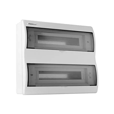 Distribution Box Rn 24 (N+PE) AP 24 Module Surface-Mounted Fuse Box Rn24 7.5 IP40 0608 Characteristics and features: adhesive label for signs, transparent dark door, terminal strips for N and PE rails, rail TH 35, the doors can be sealed, mounting type: surface-mounted, modules: 24 (2x12), dimensions: 310 x 404 x 95 mm, weight: 1.6 kg, type: 2 x 12, protection class: IP40 Temperature resistance: -25 °C + 60 °C; impact resistance: IK07; housing colour: white; window colour: transparent, dark; terminals N + PE: yes Dimensions: A - 310 mm; B - 404 mm; C - 95 mm Material: ABS plastic, Manufacturer: Elektro-Plast