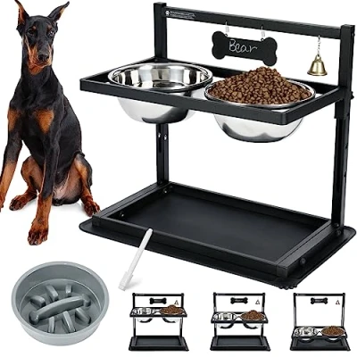 REDUCES NECK AND JOINT STRESS: SHAINFUN elevated dog bowls provides your pet with a healthier eating position and relieves stress on your dog's neck and joints while eating, perfect for large dogs and dogs with limited mobility. In addition, we offer a slow food bowl which will train your dog to eat at a slower pace.Perfect for fast eater PET INTERACTION: Special bells can be used to call your pet to eat. This dog bowl holder kit comes with a free white pen that you can use to write on the sign. Spilled water and food will land nicely on the mat STURDY ALL IRON: The dog bowl stand is made of industrial grade iron which is more durable compared to plastic bowl stands. The Dog Bowl Holder has a bottom that adjusts backward so that it does not tip over while eating Slow Food Concept: The slow food concept is widely respected by experts. Slow food bowls can help you achieve this goal. When your dog eats, the raised portion of the bowl separates the food and your dog will search for the food in the bowl, thus slowing down the rate at which he eats and helping your dog develop better eating habits CUSTOMER SERVICE: This elevated dog bowl is the latest design. We provide the best customer service to improve the product. If you have any comments and suggestions, you can contact us via email and we will give you a satisfactory answer within 12 hours