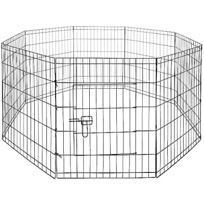 24-inch Tall: Each panel measures 24"W x 24"H; 36-inch Tall: Each panel measures 24"W x 30"H;16 square feet living area Indoor/outdoor portable pet pen creates with 8 connected panels, thumb snaps for connecting the ends together Durable wire construction made of iron with a rustproof black finish. Sets up in seconds; simply unfold, shape, and connect (no tools required) 24-inch: suitable for dogs up to 16 inches tall; 30-inch: suitable for dogs up to 20 inches tall Folds flat for easy transport and compact storage