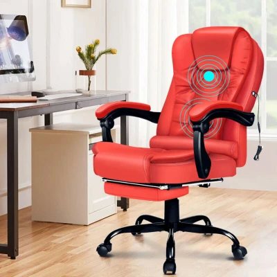 ManoManoGeneral description The ELFORDSON Massage Office Chair is designed for comfort and support during long hours of sitting. This ergonomic chair features a massage function that helps ease tension and fatigue, making it ideal for both office work and gaming sessions. With its stylish leather finish in red, it adds a modern touch to any workspace. Technical specifications Type: Home office chair Maximum weight capacity: 350 lbs Maximum height: 6β3ββ Product dimensions: 49 x 63 x 112 cm Weight: 19 kg Package dimensions: 71 x 53 x 32 cm Colour options: Black, grey, red, cream, white, pink Assembly: Required Usage This chair is equipped with a 2-zone massage feature targeting the upper and lower back, offering 3 massage modes: continuous vibration, mixed intensity, and continuous intense vibration. The massage function is powered by a USB connection, allowing you to easily select your preferred intensity with a remote control. The ergonomic design supports five regions of your spine,