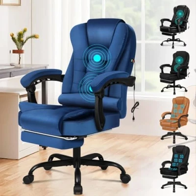 ELFORDSON Massage Office Chair for Home Office, Executive Desk 77 cm High Back 150 Recliner Tilt Function Padded Swivel, Velvet Blue
