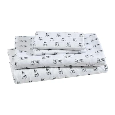 Elite Home Products Microfiber 90 GSM Whimsical Printed Deep Pocketed Sheet Set, Queen, White Bulldogs