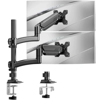 Universal Compatibility: Works with most 13-32" monitors (2-10 kg each) including Dell, HP, ASUS, Acer and Lenovo models. Supports standard VESA 75x75mm and 100x100mm mounting patterns for easy installation. Effortless Adjustments: The multi-directional joint head offers 180° swivel, -45° to +70° tilt, and 360° rotation for optimal screen alignment. Easily switch between portrait and landscape orientations with smooth, precise adjustments. Height & Stability: Engineered with a reinforced metal column and premium gas springs, this dual monitor arm lifts your displays up to 60 cm(23.6 inches)—ideal for ergonomic standing work or elevated viewing. The sturdy construction ensures reliable support, keeping screens steady even at full extension. Smart Space-Saving: Features versatile positioning - arrange monitors horizontally side-by-side or vertically stacked. Integrated cable management keeps your workspace tidy while clearing valuable desktop space. Strong & Simple Setup: Built with high-quality aluminum and zinc alloy for solid support. Installs in minutes with C-clamp (for 10-70mm thick desks) or grommet (for 10-50mm thick desks) options—no tools needed for quick workspace upgrades.