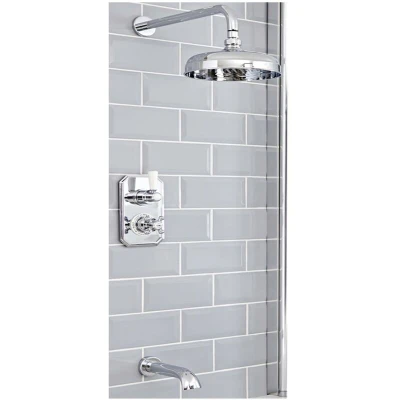 General description Enhance the elegance of your bathroom and enjoy a truly luxurious bathing and showering experience with the Milano Elizabeth two outlet system, which comprises a twin diverter thermostatic shower valve, a 205mm round shower head with wall-mounted arm, and a wall-mounted bath spout. Finished in sleek chrome with white ceramic accents, this premium quality solid brass system benefits from thermostatic control for precise adjustment of the temperature and flow of water, as well as a diverter to easily switch between the functions using the ergonomic lever and crosshead handles. The integral anti-scald technology ensures no sudden changes in temperature to keep you safe when showering or bathing. Your shower will feel relaxing and refreshing thanks to the rainfall effect coverage of the shower head, which can be perfectly positioned using the wall arm. The attractive bath spout completes the stylish look to give your bathroom a traditional feel. Technical