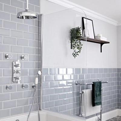 General description Enhance the classic look of your bathroom while enjoying a spa-like shower experience with the Milano Elizabeth three outlet shower system. This luxurious shower system includes a triple thermostatic diverter shower valve, a 205mm round shower head with a ceiling arm, a hand shower, and four body jets, all designed to provide a refreshing and enjoyable shower experience. Technical specifications Material: Solid brass with chrome finish Shower head diameter: 205mm Hand shower hose length: 1.75m Minimum recommended pressure: 1.0 bar Usage Thermostatic control allows for easy adjustment of water flow and temperature using traditional lever and crosshead handles. Can operate two of the three outlets simultaneously for a customizable shower experience. Swivel joint on the body jets enables adjustment of spray direction. Other information Anti-scald technology ensures safe use without sudden temperature changes. Ceramic disc technology prevents leaks and drips.