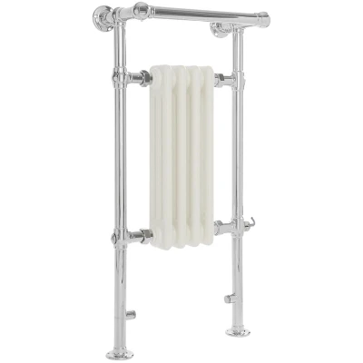 Enhance the feeling of warmth and comfort in your home with the traditional Milano Elizabeth electric heated towel rail with cast iron style insert and overhanging rail. Boasting an attractive classic design the radiator is made from premium quality steel and accentuated by a timeless chrome and white powder coated finish. The included 400W Rotfil heating element ensures that your living space will be quickly and efficiently heated to create a cosy ambiance. - Traditional electric floorstanding cast iron style insert heated towel rail with overhanging rail - Premium quality steel construction with chrome and white finish - Includes a 400W heating element - ISO9001:2015 registered manufacturer - Supplied with the fixings needed for installation - This product is covered for 10 years - Dimensions: 930mm x 452mm x 230mm Please note: The hard-wiring of the heating element should be carried out by a qualified electrician. As the heating element is self-regulating it doesn't require a