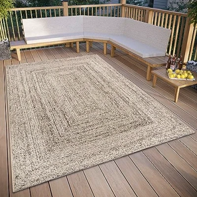Indoor and outdoor rug from Elle Decoration: our rugs are true all-rounders. You can use the rug as a living room rug, for example, but also enhance your patio with it. The outdoor rugs are flat woven, machine made, suitable for underfloor heating, robust, dirt-repellent and weatherproof The high-quality workmanship and its synthetic fibres make the rug extremely durable and thanks to the synthetic fibres it can be cleaned by washing with carpet shampoo. Colour-matched edging on all sides of the rug rounds off the overall look perfectly. Indoor and outdoor rug: you can place the rug anywhere without a guilty conscience. Such as: as a runner in the bathroom or hallway, in the dining room, as a kitchen runner or even on the balcony, terrace, conservatory or by the pool.