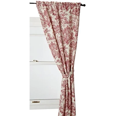 100% cotton for smoother draping effect Standard rod pockets; 3 inch hems; Includes 2 standard tiebacks Popular toile print fabric creates an updated and stylish look to any room Measurements 68-inch overall width (both 34-inch panels combined) 72-inch overall length Made in the USA; Dry clean recommended