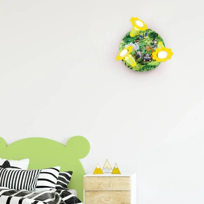 Wild journeymen - Wildnis wall light with a great Dschungel motif The modern Wildnis wall light is a high-quality children's room light made in Germany. It consists of a wooden panel with an imaginative and highly detailed Dschungel motif. Here you will find a parrot, Giraffe, Affe and co. having great adventures together. Room lighting is provided by the three movable spotlights, which can be individually aligned to illuminate every corner of the room.