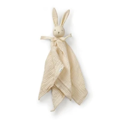 SOFT & SNUGGLY BABY COMFORTER BLANKET - A gentle, breathable muslin comforter perfect for newborns and toddlers. This lightweight baby blanket toy offers cozy snuggles, calming comfort, and a soothing sense of security—day or night, at home or on the go. PREMIUM MUSLIN MATERIAL – SAFE FOR NEWBORNS Made from soft, natural cotton muslin with 100% organic cotton shell and hypoallergenic polyester padding. OEKO-TEX Standard 100, Class 1 certified – safe for the most sensitive skin and suitable from birth. AESTHETIC NURSERY DESIGN – EXCLUSIVE COLORS Our bunny baby comforter comes in a range of beautiful pastel and earthy tones to complement your nursery décor. Designed with soft embroidery, subtle details, and a modern Scandinavian feel. PERFECT BABY SHOWER OR NEWBORN GIFT This sweet muslin comfort toy makes a thoughtful and timeless gift for baby showers, newborn arrivals, birthdays, and holidays. Delicate bow detailing adds a charming touch for gifting moments. MACHINE WASHABLE & TRAVEL-FRIENDLY Easy-care baby comfort blanket – machine washable at 30°C and tumble drying is not recommended. Sized perfectly (46.5 cm) to tuck into a diaper bag, stroller, or crib for cuddles on the go.
