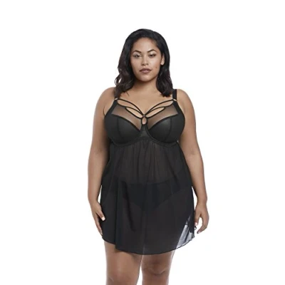 Baby doll features semi-sheet to translucent four-panel bra cups that will provide a fantastic lift, defined separation, and a desirable rounded shape with a plunging neckline adorned with sexy strapping to accent fabulous cleavage Stretch mesh front and back skirts, cut generously, finish at mid-thigh Cotton lined side panel for a soft finish next to the skin Hook and eye fastening with keyhole detail at center back for ease of wear