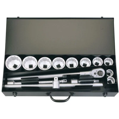 General description This is a professional-quality socket set made from chrome vanadium steel, which is hardened, tempered, and chrome plated for corrosion resistance. It is designed for durability and reliable performance in various applications. The set is stored in a heavy-duty steel case for easy organization and transport. Technical specifications Material: Chrome vanadium steel Finish: Chrome plated for corrosion protection Contents: 10 bi-hexagon sockets (36mm, 41mm, 46mm, 50mm, 55mm, 60mm, 65mm, 70mm, 75mm, 80mm) 1 reversible ratchet 2 extension bars (200mm and 400mm) 1 sliding T-bar Compatibility and accessories Compatible with standard 1-inch square drive tools Includes extension bars and a T-bar for versatile use Installation No installation required; simply select the appropriate socket and attach it to the ratchet or extension bar for use. Usage Ideal for professional and DIY tasks involving nuts and bolts. Suitable for automotive, machinery, and general maintenance work.