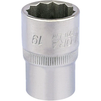 General description This is a professional-grade 19mm (3/4 inch) square drive socket designed for use with Elora bi-hexagon nuts. Manufactured from high-quality chrome vanadium steel, it is hardened, tempered, and chrome plated to ensure durability and corrosion resistance. The socket features a chamfered end for easy and secure nut engagement and a hole for a spring-loaded driving accessory. It is sold loose and suitable for various heavy-duty applications. Technical specifications Material: Chrome vanadium steel Size: 19mm (3/4 inch) Drive Size: 1/2 inch square drive Manufacturing Standards: DIN 3124/ISO 2725 and DIN 3120/ISO 1174 Finish: Chrome plated for corrosion protection Compatibility and accessories Compatible with 1/2 inch drive ratchets and extensions Designed for use with Elora bi-hexagon nuts Features a hole for spring-loaded driving accessories Installation Insert the socket onto a compatible 1/2 inch drive ratchet or extension Ensure the socket is properly seated on the