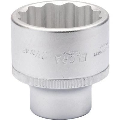 General description This is a professional-quality square drive socket designed for use with Elora bi-hexagon fasteners. Made from durable chrome vanadium steel, it is hardened, tempered, and chrome plated to resist corrosion. The socket features a chamfered end for easy and secure nut engagement, and includes a hole for a driving accessory with a locking pin. Some sizes have a knurled band for improved grip during use. Technical specifications Material: Chrome vanadium steel Finish: Chrome plated for corrosion resistance Size: 2.1/16 inch (approximately 53 mm) Drive size: 3/4 inch square drive Standards: Manufactured according to DIN 3124/ISO 2725 and DIN 3120/ISO 1174 Compatibility and accessories Compatible with Elora bi-hexagon fasteners Compatible with standard 3/4 inch drive tools Includes a hole for attaching a driving accessory with a locking pin Installation Insert the socket onto the compatible drive tool (e.g., ratchet or wrench) Ensure the socket is securely attached