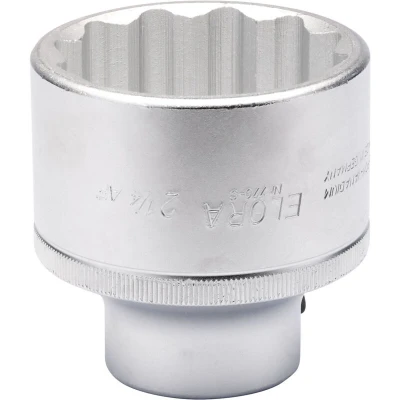 General description This is a professional-quality square drive socket designed for use with Elora bi-hexagon fasteners. Manufactured from durable chrome vanadium steel, it is hardened, tempered, and chrome plated to resist corrosion. The socket features a chamfered end for easy and secure nut engagement, and includes a hole for attaching a driving accessory with a locking pin. Some sizes have a knurled band for improved grip during use. Technical specifications Size: 2 1/4 inches (outer) Drive size: 3/4 inch Material: Chrome vanadium steel Finish: Chrome plated for corrosion resistance Manufactured according to DIN 3124/ISO 2725 and DIN 3120/ISO 1174 standards Compatibility and accessories Compatible with square drive tools and Elora bi-hexagon fasteners Includes a hole for a locking pin to secure accessories Some sizes feature a knurled band for better grip Installation Attach the socket to a compatible ratchet or drive tool with a 3/4 inch drive size Ensure the socket is properly