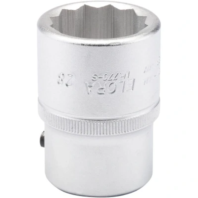 General description This is a 28mm (3/4 inch) square drive bi-hexagon socket designed for professional use. It is compatible with various tools and suitable for precise and secure fastening tasks. The socket features a chamfered end for easy nut engagement and a hole for a driving accessory with a locking pin, ensuring secure attachment. Some sizes include a knurled band for improved grip during use. Manufactured from high-quality chrome vanadium steel, it is hardened, tempered, and chrome plated for corrosion resistance. Technical specifications Size: 28mm (3/4 inch) Material: Chrome vanadium steel Finish: Chrome plated for corrosion protection Standards: DIN 3124/ISO 2725 and DIN 3120/ISO 1174 Compatibility and accessories Compatible with standard 3/4 inch drive tools Designed for use with driving accessories that fit the hole for locking pins Installation Insert the socket onto a compatible 3/4 inch drive ratchet or wrench Ensure the locking pin is engaged if using a driving