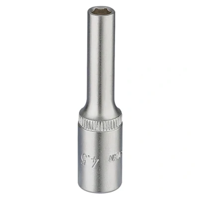 General description This is a professional-quality 1/4" square drive deep socket made from hardened chrome vanadium steel, ensuring durability and corrosion resistance. It features a chamfered end for easy nut alignment and entry, and a hole for a spring-loaded ball bearing to secure accessories. The socket has an overall length of 50mm, making it suitable for deep fastening tasks. Technical specifications Size: 4.5mm Type: Deep socket Drive size: 1/4 inch Material: Hardened chrome vanadium steel Finish: Chrome plated for corrosion protection Overall length: 50mm Compatibility and accessories Compatible with 1/4" square drive tools Features a hole for a spring-loaded ball bearing to hold accessories securely Installation Attach the socket to a compatible 1/4" drive ratchet or wrench Ensure the spring-loaded ball bearing engages properly to secure accessories Usage Use for tightening or loosening nuts and bolts with a 4.5mm size Ideal for deep fastening applications where extended